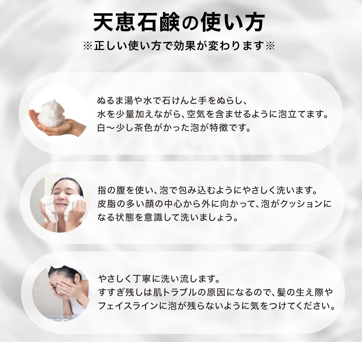 石鹸をよく泡立て、泡で包み込むようにやさしく洗います。